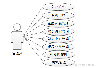 - 商城管理:包括选课商城、分类列表、订单列表等功能,管理员可以管理课程商城的商品、分类和订单情况。