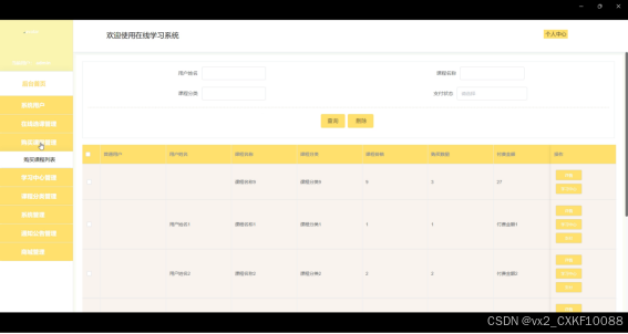 管理员对用户的课程购买情况进行管理和跟踪,包括订单管理、支付状态监控等。管理员可以查看用户的购买记录、课程订单信息,及时处理订单中的问题和异常情况。同时,管理员还可以对课程的售卖情况进行统计分析,了解课程的热度和销售趋势,为课程的推广和营销提供数据支持。界面如下图所示。
