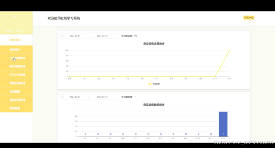 后台首页提供商品销售金额和数量的统计数据,以图表形式展示,方便管理员进行销售数据分析。通过直观的图表展示,管理员可以快速了解不同课程的销售情况和趋势,帮助进行销售业绩的评估和预测。同时,管理员还可以根据这些数据制定营销策略和课程调整计划,以提高课程的吸引力和销售量。这些统计数据也有助于管理员及时发现销售异常情况,及时调整经营策略,保持课程销售的稳定和健康发展。界面如下图所示。