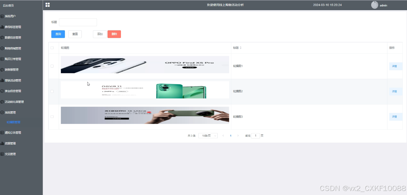- 系统管理:管理上传、编辑和管理在首页展示的轮播图片,用于推广活动或重要信息展示。