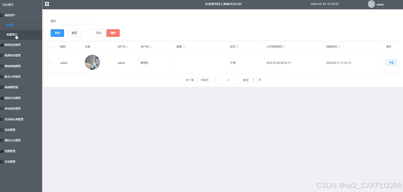 基于大数据的线上购物活动分析中的管理人员是可以对注册的用户进行管理的,也可以对管理员进行管控。界面如下图所示。