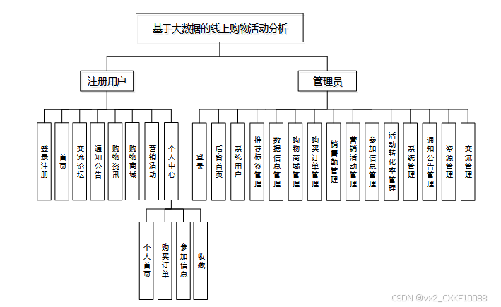 按照基于大数据的线上购物活动分析的设计与实现的角色,划分为了普通用户模块、管理员模块这两大部分。