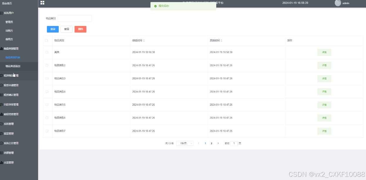 (3)物品类别管理:管理员点击“物品类别管理”可以对系统的租赁物品类别信息进行管理。