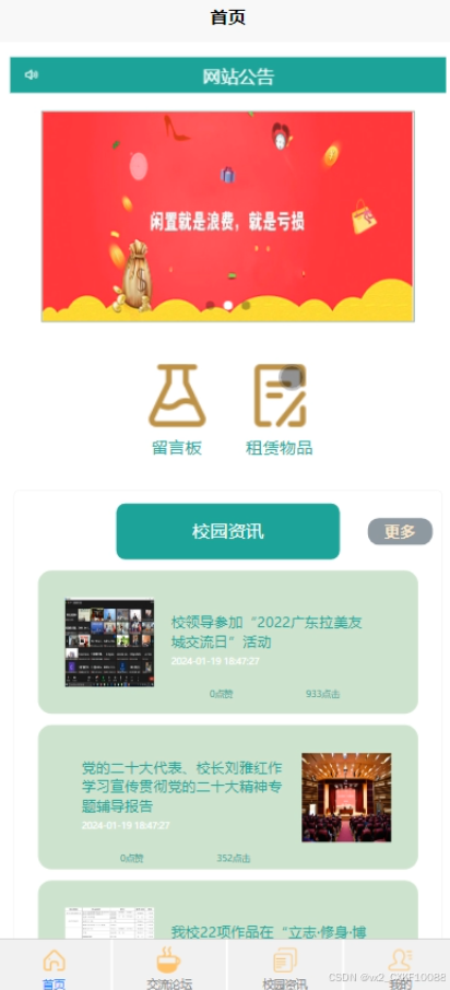 (2)首页模块:用户可以查看基于微信小程序的“不借”校园物品租赁平台的首页信息包括主导航、留言板、租赁物品、交流论坛、校园资讯等。