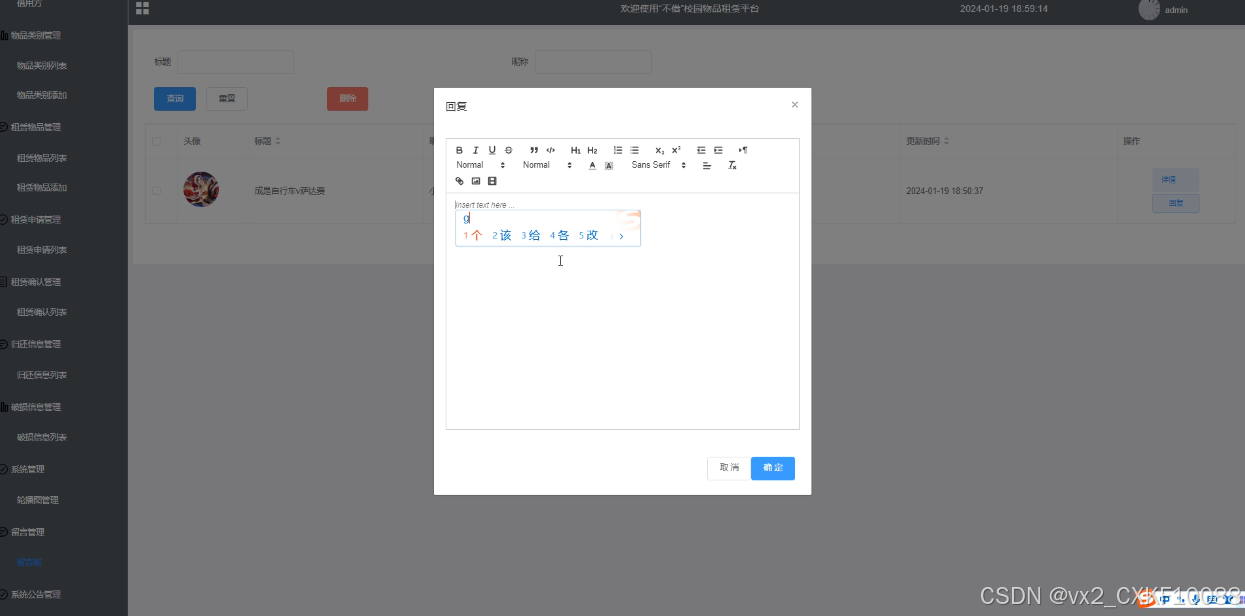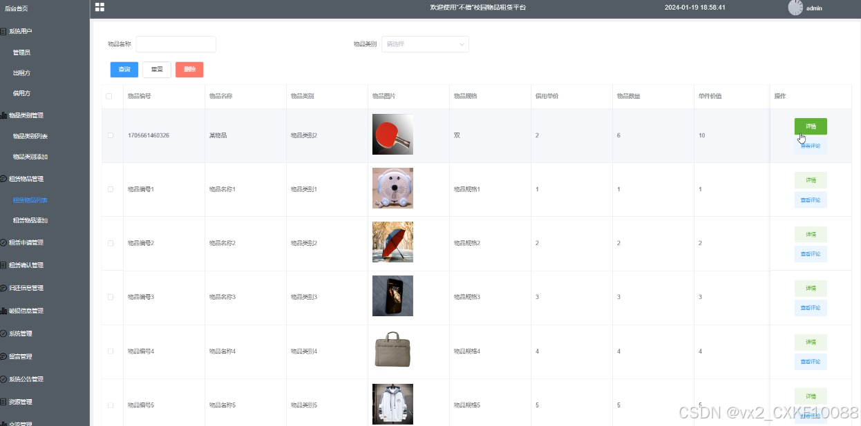 管理员点击“租赁物品管理”会显示出所有的校园物品租赁,支持输入物品名称或物品类别对信息进行查询,如果想要添加新的校园物品租赁信息,点击“添加”按钮,输入物品名称、物品规格、借用单价、物品数量、单件价值、物品介绍、出租方、出租人名等信息,点击“提交”按钮就可以添加了,同时可以选择某一条校园物品租赁信息,点击“删除”进行删除,也可以对用户提交的校园物品租赁信息评论的信息进行管控。