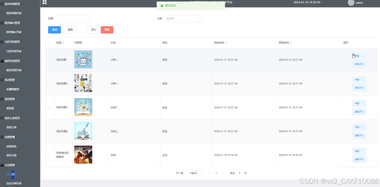管理员点击“留言管理”会显示出用户提交所有的留言信息,点击详情可对留言内容进行回复。管理端留言管理实现图如下所示。
