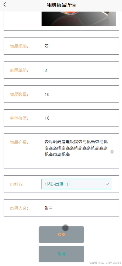 (4)租赁物品:用户点击首页的“租赁物品”按钮,可以查看到租赁物品信息列表,点击可查看包括物品规格、借用单价、物品数量、单件价值、物品介绍、出租方、出租人名的详情信息,用户可以进行点赞、评论、收藏等操作,其中借用方还可以进行租赁申请操作。