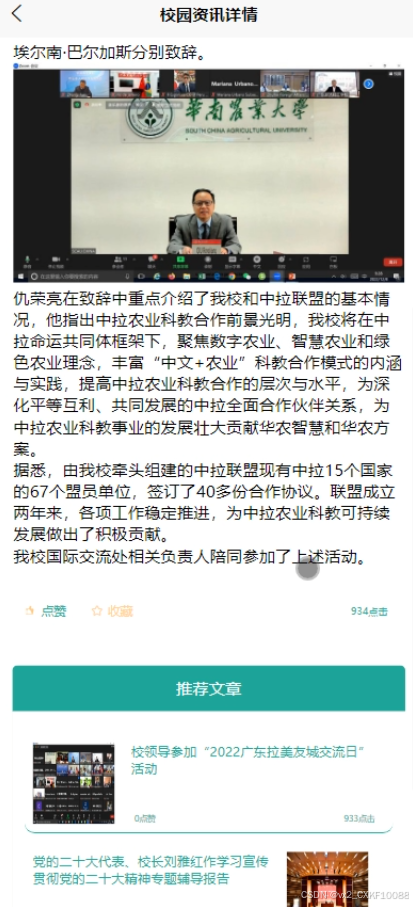 (6)校园资讯模块:当用户点击下方导航栏的“校园资讯”按钮,会显示管理员在后台发布的所有校园资讯列表信息,可以查看详情,也可以进行收藏、点赞、评论等。