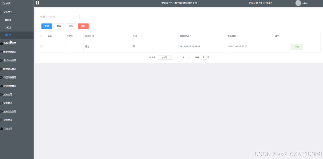在后台系统用户管理中,主要是管理注册的借用方、出租方和管理员,管理员拥有对所有用户管控的功能。管理端系统用户实现图如下所示。
