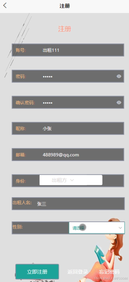 (1)用户注册登录:游客可以随时进入到系统中,对系统中的信息浏览,但是想要实现校园物品租赁或发表评论等操作,就必须有这个系统的账号,如果没有账号的话,可以注册用户进行相关的操作。