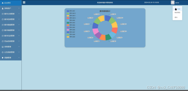 - 后台首页:管理员可以在此页面操作所有的操作系统和查看图书借阅统计图。