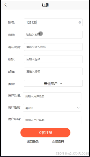 用户注册,在用户注册页面通过填写用户名、密码、姓名、手机、邮箱等信息完成用户注册,如图5-2所示。