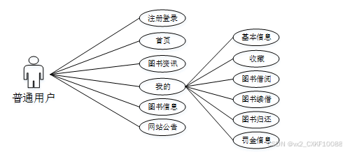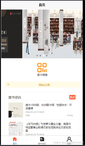 - 首页:用户在首页可以查询到图书资讯、我的、图书信息、网站公告等功能操作。