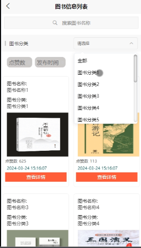 图书信息,用户可以在图书信息列表中查看所有的图书信息,也可以按图书分类进行查找,并可以点赞、收藏和评论等功能。如图5-6所示。