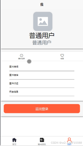 - 我的:用户可以在此页面操作基本信息、收藏、图书借阅、图书续借、图书归还、罚金信息等功能。