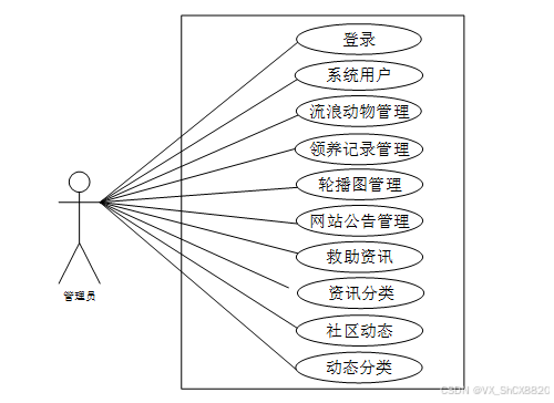 流浪动物信息交流平台中管理员角色用例图如图2.2所示:
