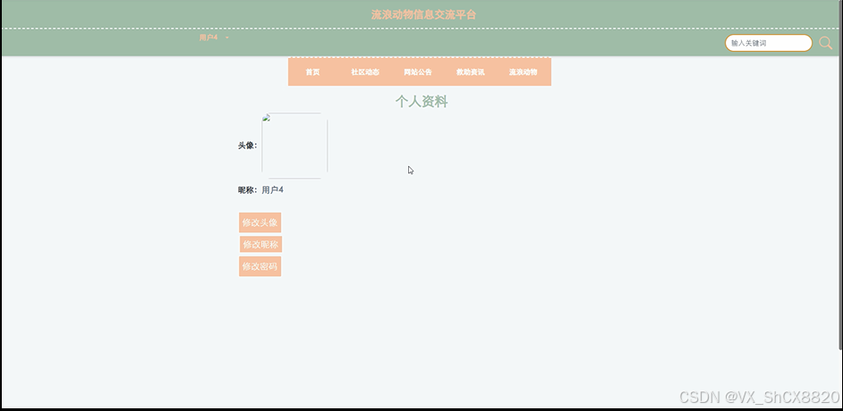 (8)个人中心:当用户点击右上角“我的”按钮下面的“个人中心”,会出现子菜单,可以对个人首页、流浪动物、领养记录、收藏等进行管理;