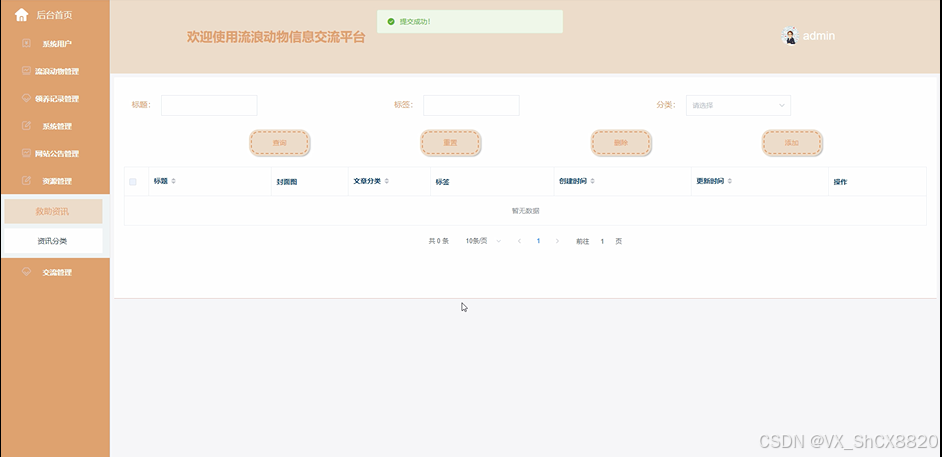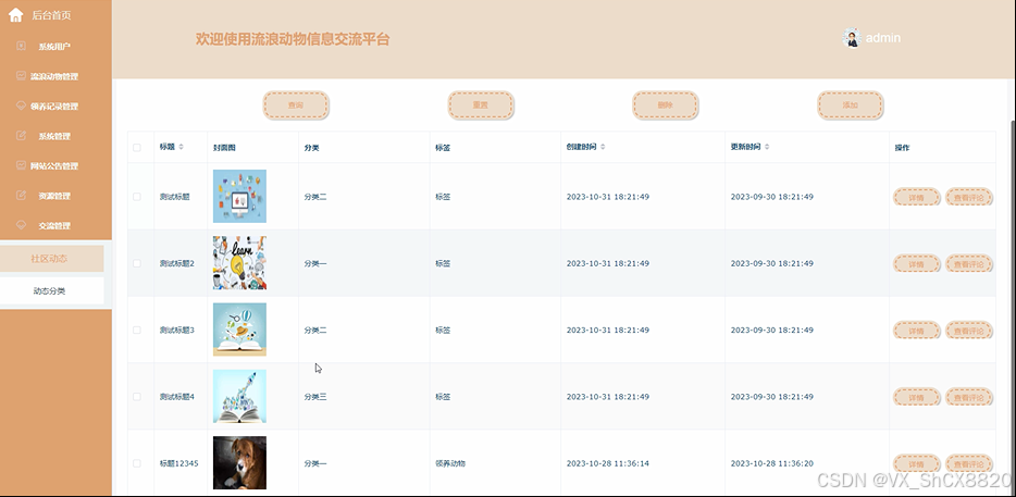 管理员点击“交流管理”这一菜单会显示社区动态、动态分类这两个子菜单,支持通过标题或者输入分类对社区动态信息进行查询,如果想要添加新的社区动态信息,点击“添加”按钮,输入相关信息,点击“提交”按钮就可以添加了,同时可以选择某一条社区动态信息,点击“删除”进行删除。界面如下图4.16所示。