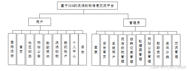 流浪动物信息交流平台整体的功能模块包括管理员+注册用户两个模块,实现了对流浪动物相关信息的查询管理,系统功能模块如图所示。