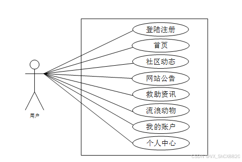 流浪动物信息交流平台中用户角色用例图如图2.1所示: