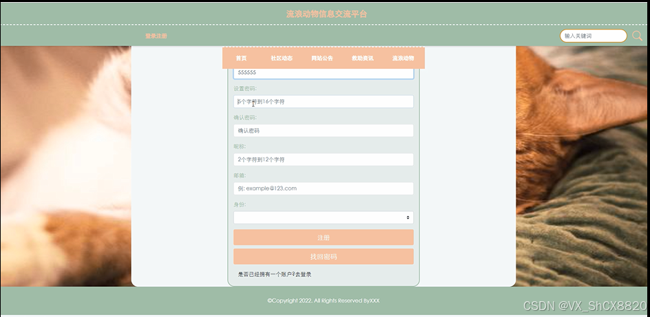 不是流浪动物信息交流平台中用户的是可以在线进行注册的,当用户点击左上角“登陆注册”按钮的时候,当填写上自己的账号+密码+确认密码+昵称+邮箱+手机号等信息后再点击“注册”按钮后将会先验证输入的有没有空数据,再次验证密码和确认密码是否是一样的,最后验证输入的账户名和数据库表中已经注册的账户名是否重复,只有都验证没问题后即可注册成功。其用户注册界面展示如下图4.2所示。