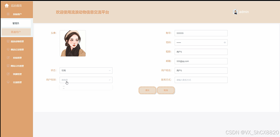 流浪动物信息交流平台的理员拥有最高的权限,可以对用户信息、系统信息以及物流相关信息进行管控。