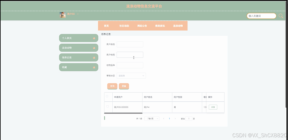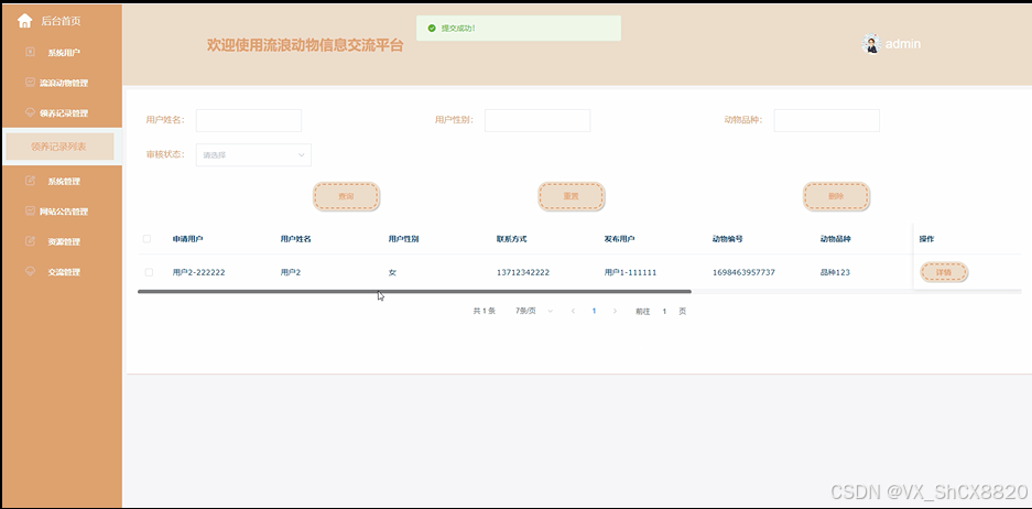 (5)领养记录管理:管理员点击“领养记录管理”会显示出所有的领养信息,支持输入用户姓名、用户性别或者动物品种对领养信息进行查询,可以对领养信息进行查看详情、重置、删除等操作;