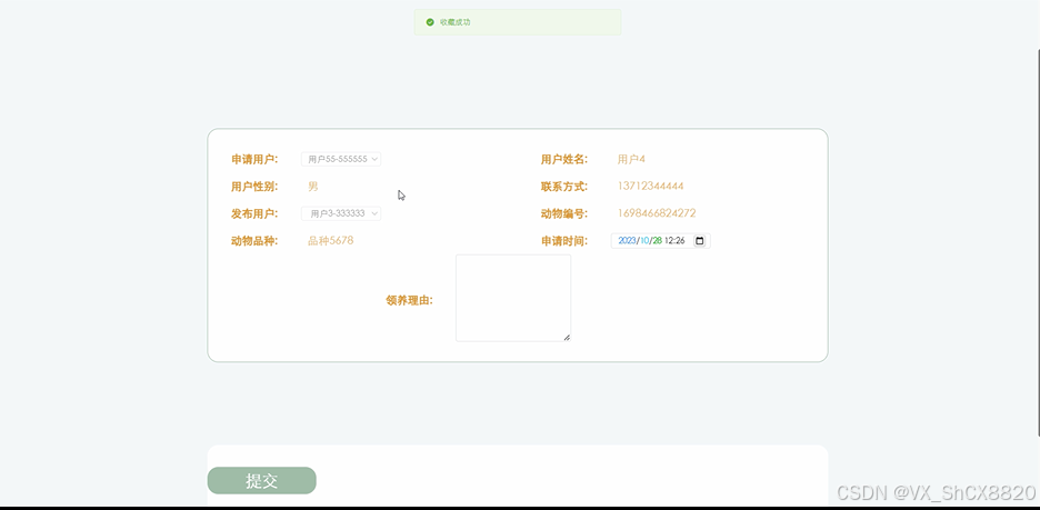 (6)领养:当用户在流浪动物详情界面想要进行申请领养,点击下方的“申请领养”按钮,就会跳转到申请领养信息填写界面,根据界面提示输入申请领养信息,点击“提交”按钮,领养就完成了;