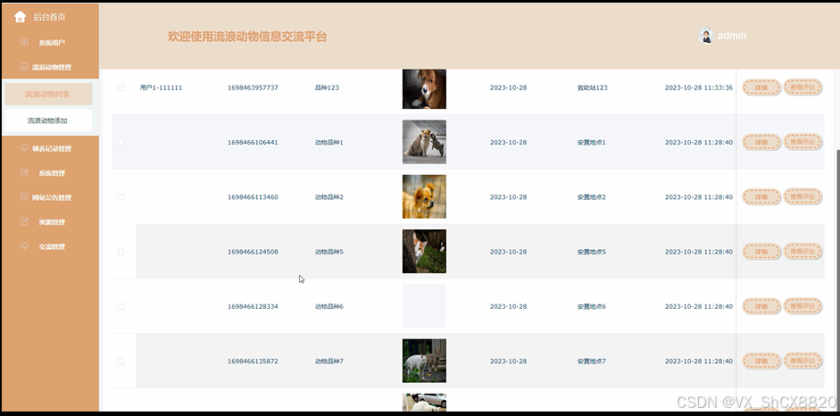 This article uses SSM as the development technology to implement an information exchange platform for stray animals. The main users of the stray animal information exchange platform are divided into users and administrators. The administrator functions include: backend homepage, system users (administrators, regular users), stray animal management (stray animal list, stray animal addition), adoption record management, system management (carousel management), website announcement management, resource management (rescue information, information classification), and communication management; The front-end user functions include: login registration, homepage, community updates, website announcements, rescue information, stray animals, my account (changing profile picture, nickname, password), personal center (personal homepage, stray animals, adoption records, favorites), and other functions. Through the design of these functional modules, the entire process of information exchange platform for stray animals has been basically achieved.