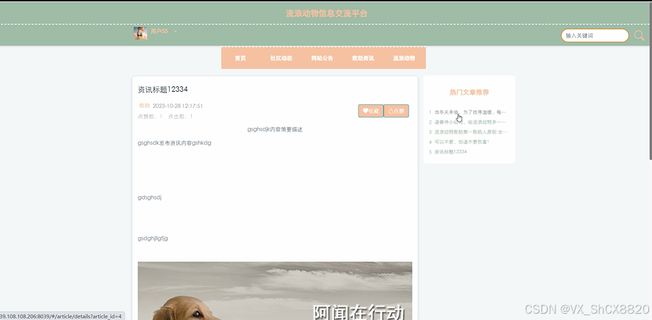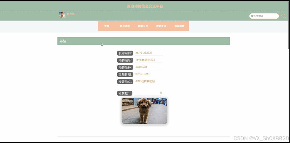 (5)流浪动物:当用户点击“流浪动物”这一菜单按钮,会显示管理员在后台发布的所有的流浪动物信息,支持通过关键词对流浪动物进行搜索,选择感兴趣的流浪动物点击可以进入到流浪动物详细的介绍界面,在详细界面可以查看到流浪动物的图片、发布用户、动物编号、动物品种、发现日期、安置地点、点赞数等信息,同时可以进行申请领养、点赞、收藏、评论操作;