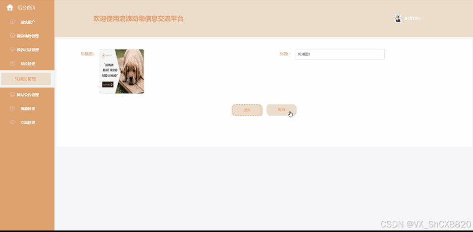(2)系统管理:管理员点击“系统管理”这一菜单会显示轮播图这一个子菜单,管理员可以对前台展示的轮播图进行设置;