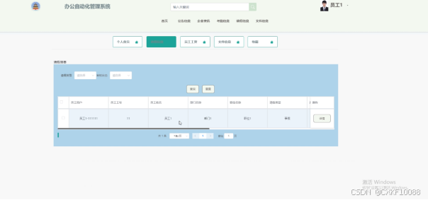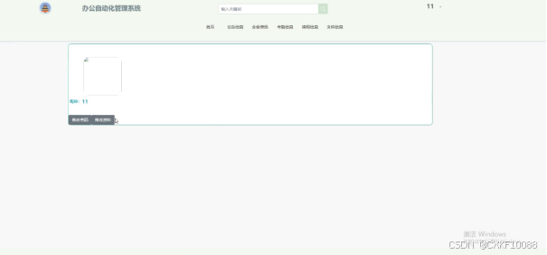(9)个人中心:当用户点击右上角“个人中心”这个按钮,就会进入到对应的后台进行信息的管理了。用户在前台点击“个人中心”可以对个人首页、请假信息、员工工资、文件信息和自己收藏的信息进行管理。