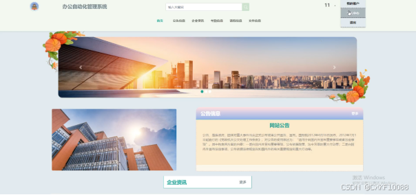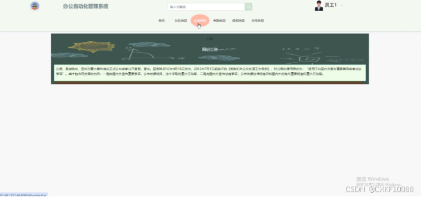 (2)查看办公自动化管理系统的首页信息:办公自动化管理系统的首页信息包含了首页、公告信息、企业资讯、考勤信息、请假信息、文件信息等。