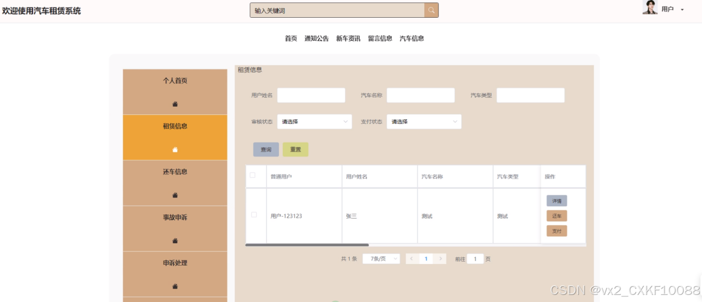 ● 租赁信息:用户可以查看自己的租赁订单详情,包括租赁时间、车辆信息等。