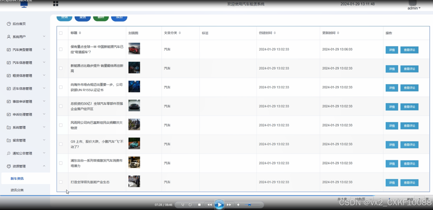 当点击“资源管理”这一菜单的时候,会出现新车资讯+资讯分类这两个子菜单,可以对这两个模块进行增删改查操作。资源管理界面如下图所示。