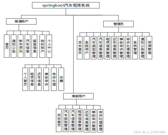 汽车租赁系统的开发主要是解放双手,提高效率,为企业的发展进行添砖加瓦,所以在系统的功能方面我们首先要从企业管理的角度进行,然后再从用户的角度进行,确保能够满足每个用户的需求,因此在功能上主要规划了普通用户、商家用户和管理员三大部分,实现了注册登录、用户管理、汽车类型管理、汽车信息管理、租赁信息管理、还车信息管理、事故申诉管理、申诉处理管理、等功能。