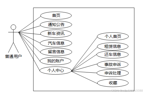 汽车租赁系统中普通用户角色功能包含了首页、通知公告、新车资讯、汽车信息、留言信息、我的账户、个人中心(个人首页、租赁信息、还车信息、事故申诉、申诉处理、收藏)等功能,普通用户的用例图如图3.1所示: