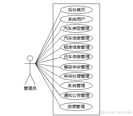 汽车租赁系统中管理员角色功能包含了后台首页、系统用户、汽车类型管理、汽车信息管理、租赁信息管理、还车信息管理、事故申诉管理、申诉处理管理、系统管理、留言管理、通知公告管理、资源管理等功能,管理员的用例图如图3.3所示: