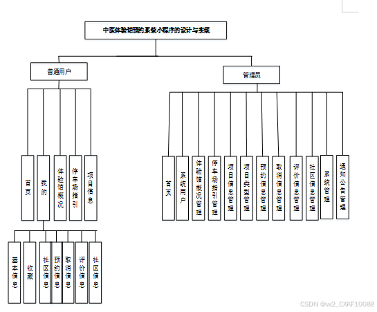 按照中医体验馆预约系统小程序的角色,划分了普通用户管理模块、管理员管理模块这两大部分。
