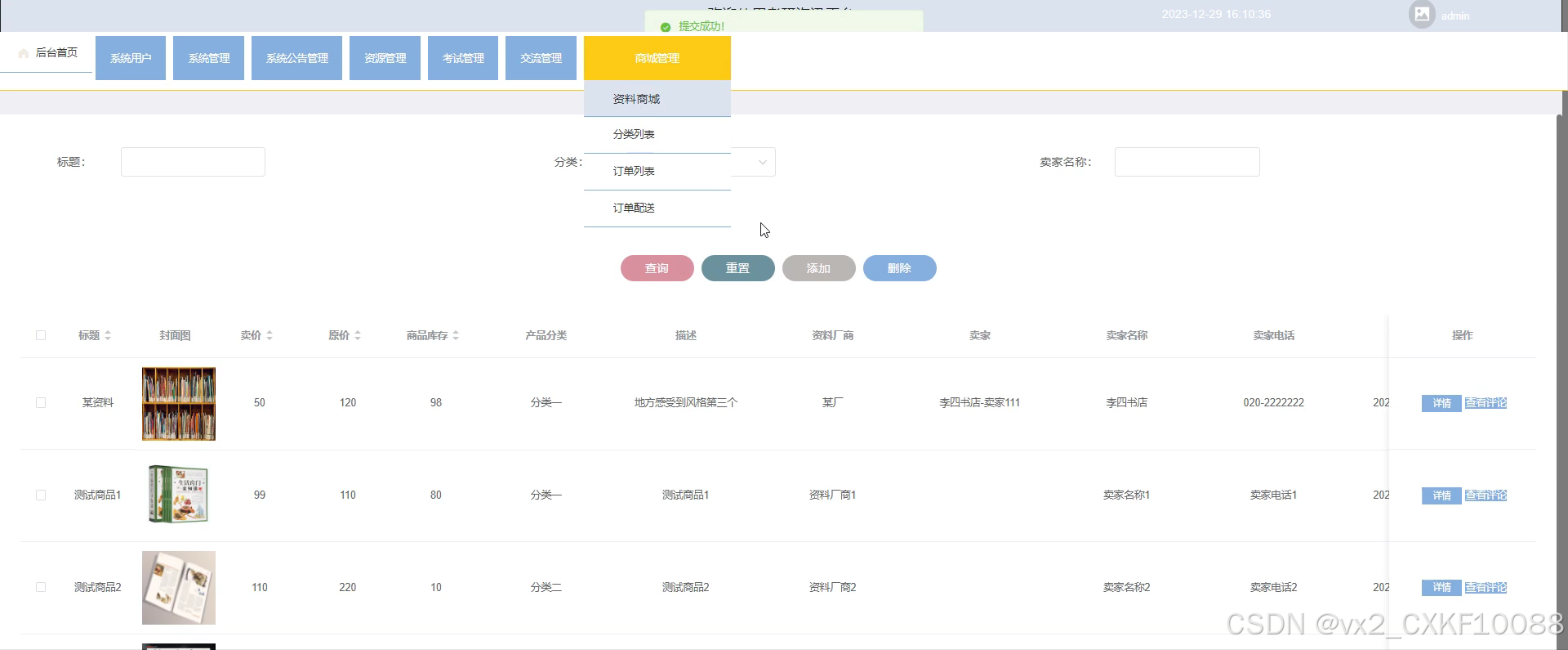 商城管理,在商城管理列表中可以对考研资料商品信息进行增删改查操作,如图4-10所示。