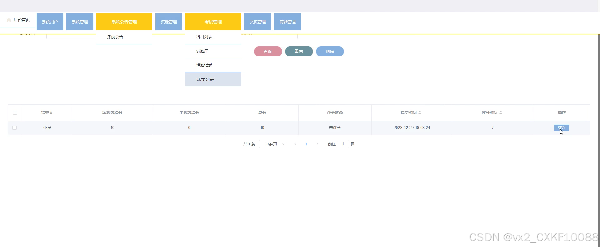 考试管理,在考试管理可以对试题进行增删改成,如图4-9所示。