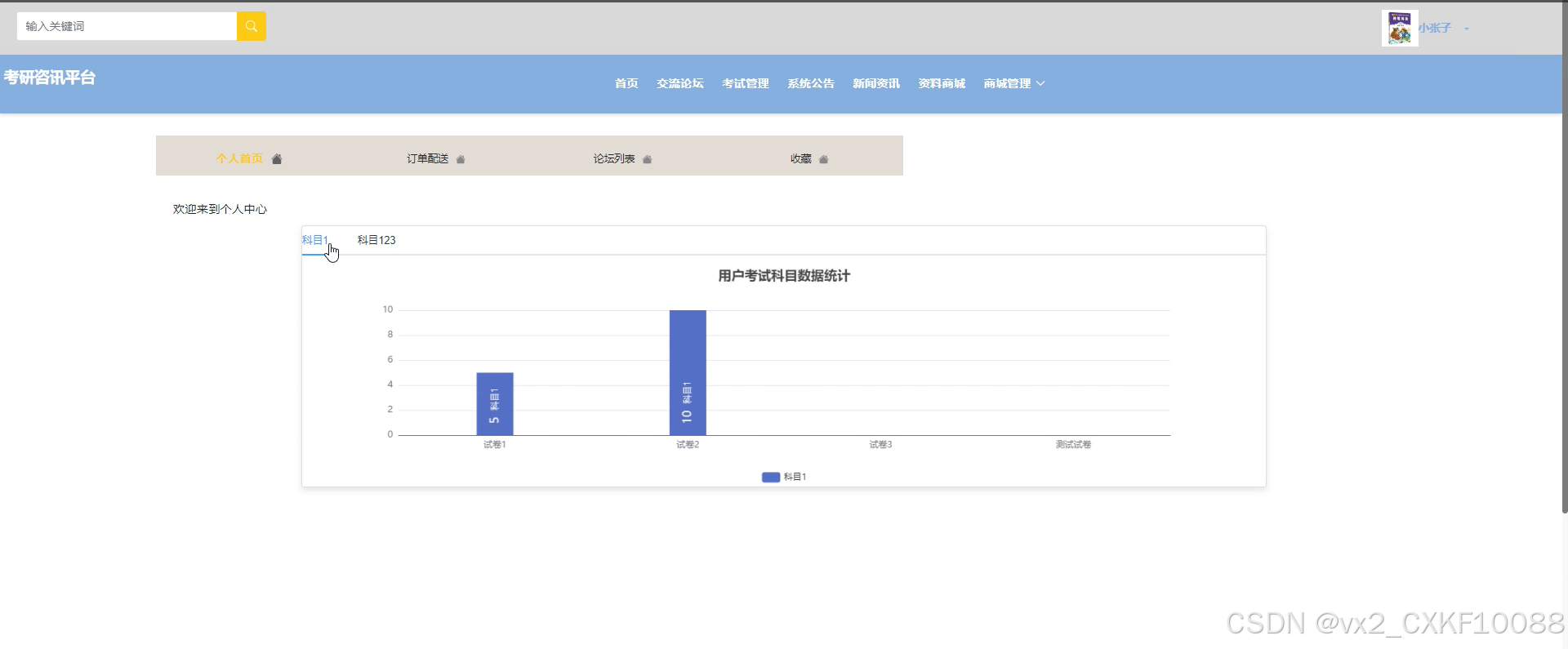 管理员登录进入考研资讯平台可以查看首页、用户管理、考试管理、商城管理、资源管理等信息,如图4-6所示。