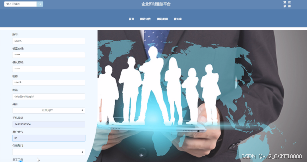 首页作为用户访问的入口,展示了系统的整体概况和导航功能;网站公告和网站新闻模块提供了重要通知和企业动态的展示和发布平台;聊天室则实现了用户之间的实时交流和信息共享,促进了团队协作和工作效率的提升。