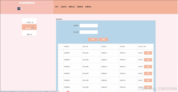 The management system adopts a B/S structure and adopts a web page interaction method, using MySQL as the database and myeclipse as the software's programming language. Its two main parts are: administrators and users. The functions of a manager include homepage, system users, film and television resource management, film and television works management, system management, website announcement management, resource management, and communication management; The user's functions include homepage, communication forum, website announcement, film and television information, film and television works, and personal center (film and television resources, collections).