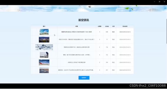 航空资讯查看功能包括浏览最新航空业新闻、航班动态等信息。用户可登录系统查看航空资讯,包括航空公司新闻、航班延误信息、机场情况等。系统提供清晰的资讯展示页面,用户可以方便快捷地获取最新航空资讯,了解行业动态。航空资讯查看功能有助于用户了解航空业发展趋势、航班状态及相关信息,提高用户对航空业务的了解和关注度,为用户出行提供更全面的信息支持。界面如下图所示。