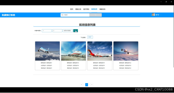 航班订票功能允许用户选择航班、填写乘客信息、选择座位、支付订单。用户登录系统后,浏览航班信息并选择合适航班,填写乘客信息并选择座位,完成订单支付。系统验证信息准确性,生成电子票并发送确认信息。界面如下图所示。