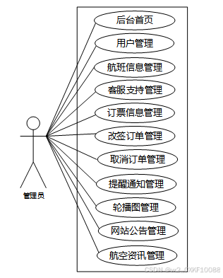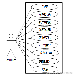 系统用例分析是对系统中各个功能模块的用户需求和行为进行分析,以识别和描述不同的用户用例。通过系统用例分析,可以深入了解用户在平台上的操作流程和交互方式,为系统设计和开发提供指导,并确保平台能够满足用户的需求和期望。机票预订系统中用户角色用例图如图2.1所示: