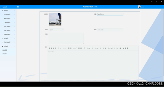 航空资讯管理功能包括发布、编辑、删除航空相关新闻、航班信息等。管理员可登录系统管理航空资讯,包括发布最新行业资讯、航班动态、特别活动等内容。管理员可以编辑已有资讯内容,删除过期或错误信息,确保资讯页面的准确性和实用性。界面如下图所示。