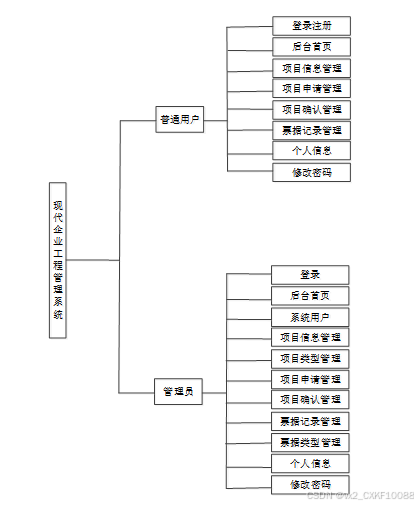 根据现代企业工程管理系统的角色需求分析,可以划分为普通用户和管理员两大模块。具体功能如下: