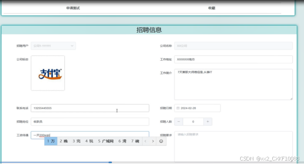 申请面试:用户可以通过系统申请感兴趣的兼职职位,并进行面试预约等操作。